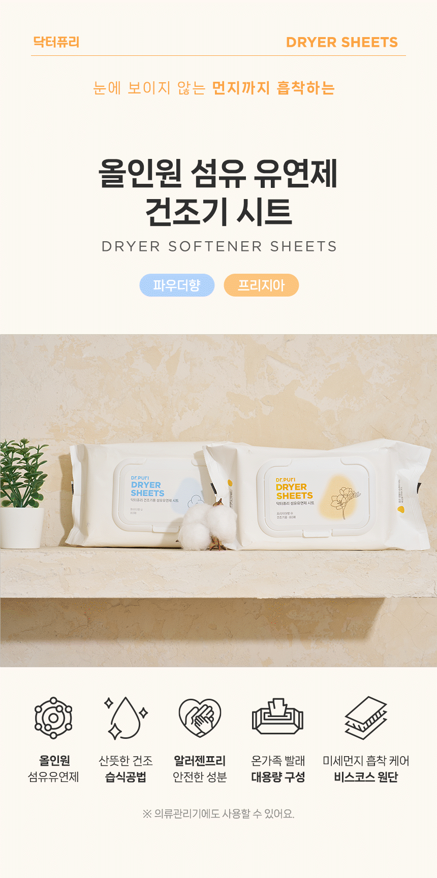 건조기를 쓴다면, 따로 써줘야 하는 건조기용 섬유유연제 시트.은은한 향과 부드러운 옷감 그리고 정전기 방지까지.