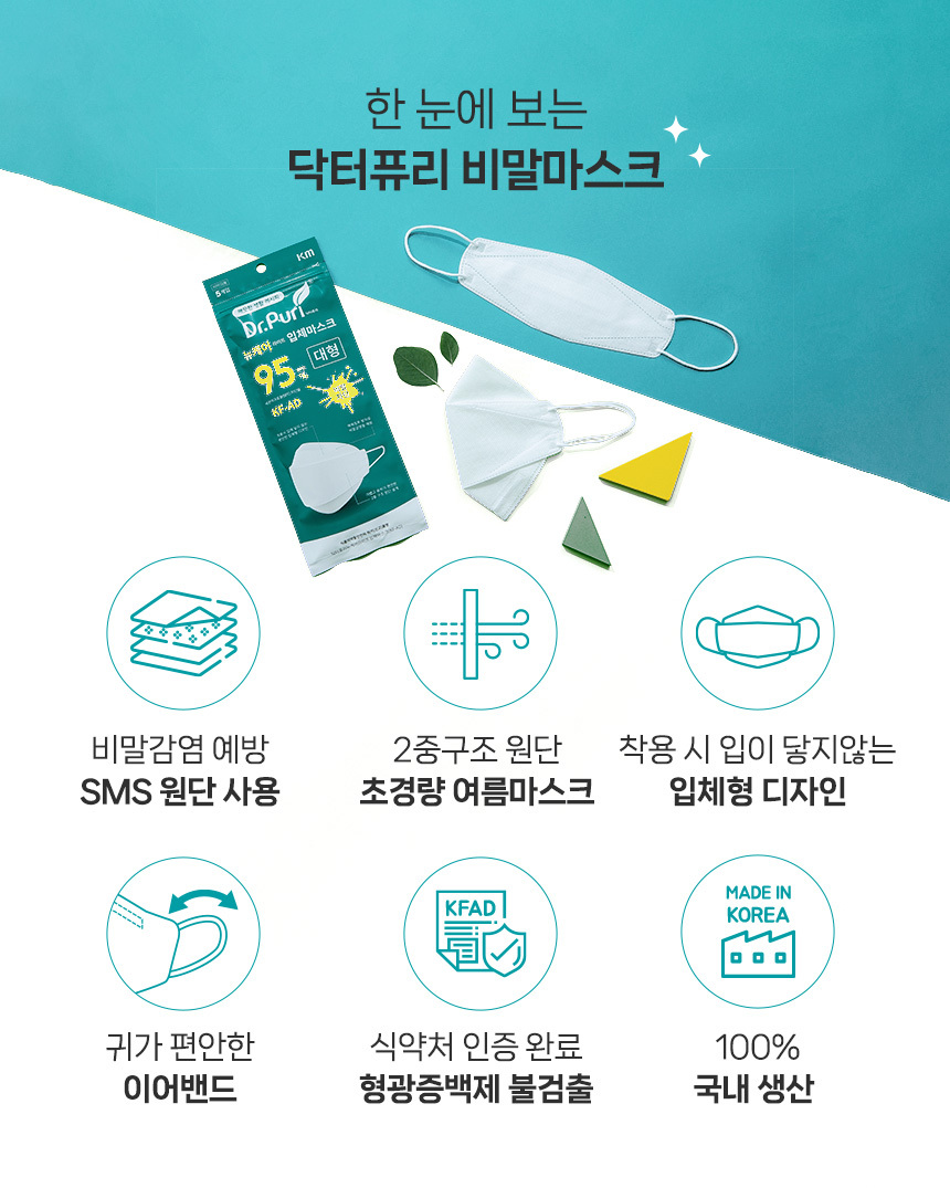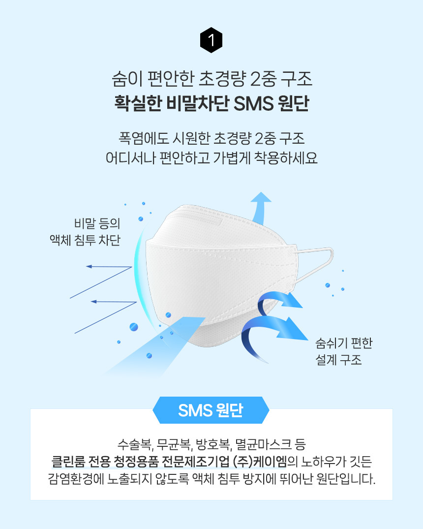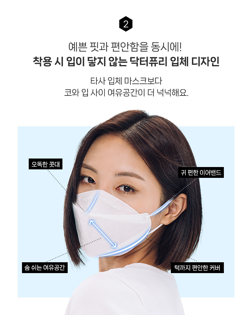 착용시 입이 닿지 않는 입체형 2중 구조 원단설계로 더욱 편안해진 호흡.