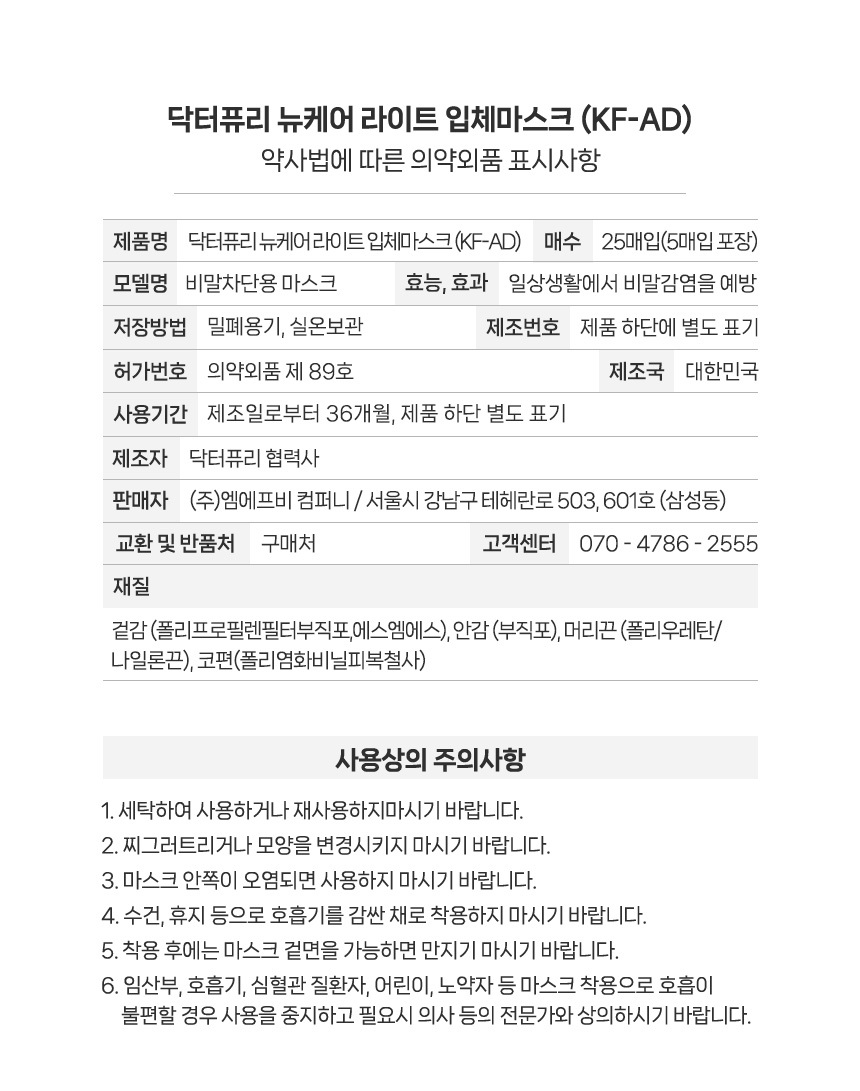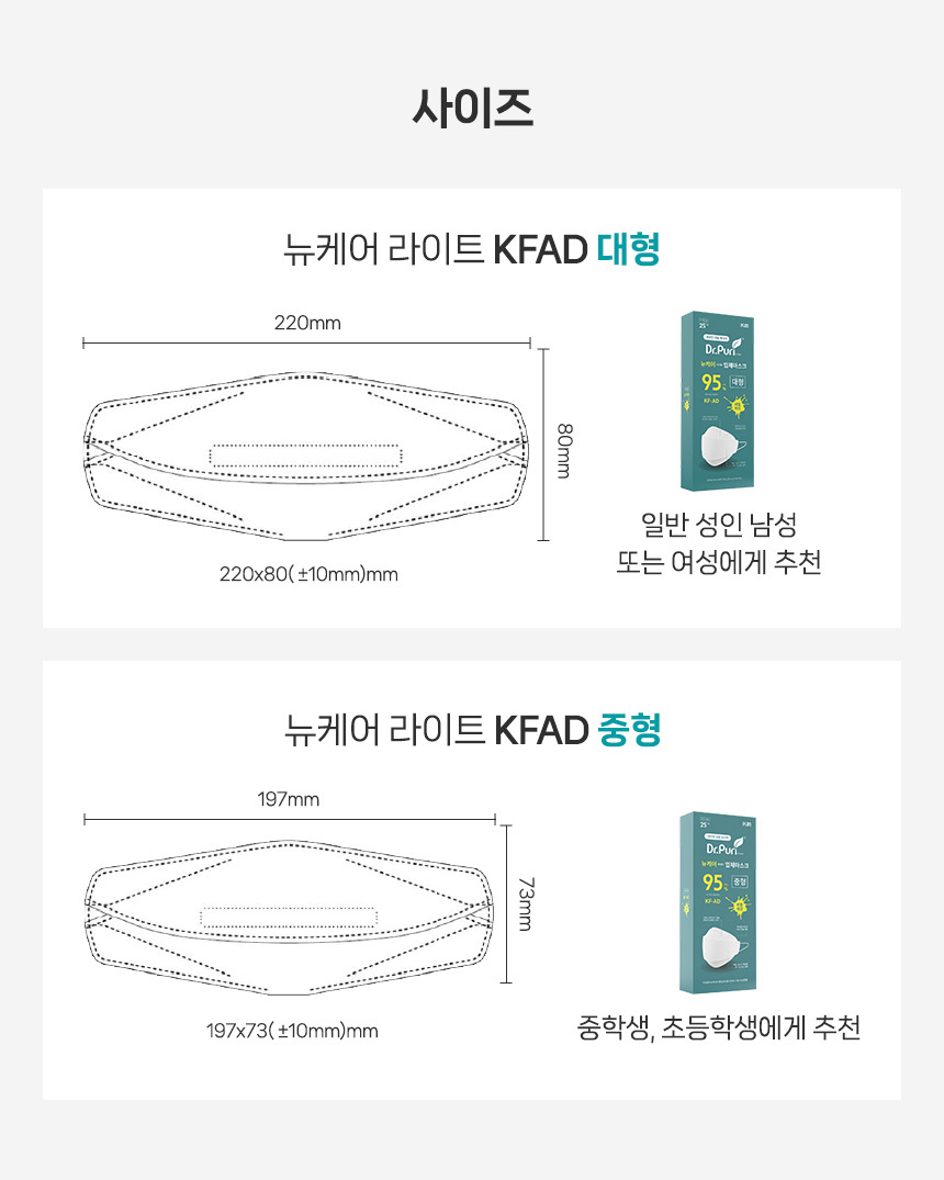 ★대용량특가전★ KFAD 비말차단 뉴케어 라이트 입체마스크 25매 x 20개입, 1박스